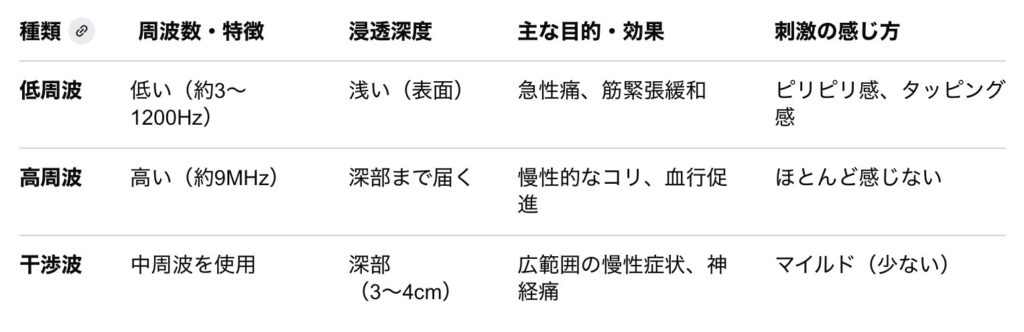 一般的な整骨院で「ビリビリ」と感じる刺激のものとは電気刺激の周波数が違っていて、低周波治療器を使っている整骨院もいまだに存在しています。低周波は浅い部分にある筋肉には効果が期待できますが適応が限局的といえます。また中間の周波数である干渉波や高周波ではビリビリ感が軽減し、ややマイルドな刺激となりますが、深い部分の筋肉に働きかけコリや慢性的な疼痛の軽減に期待ができます。
